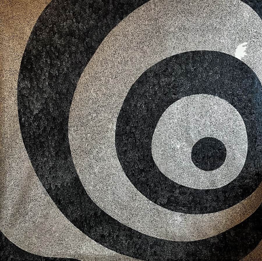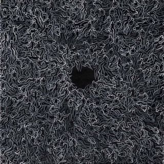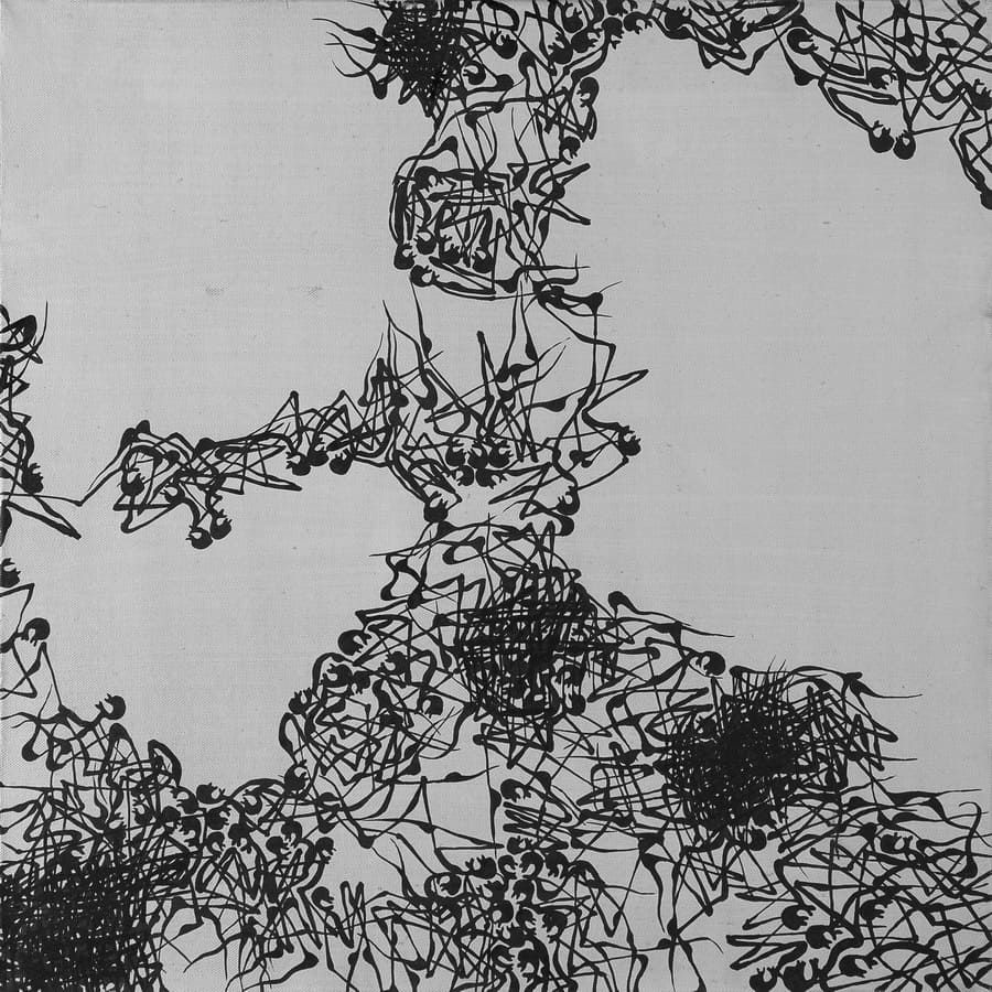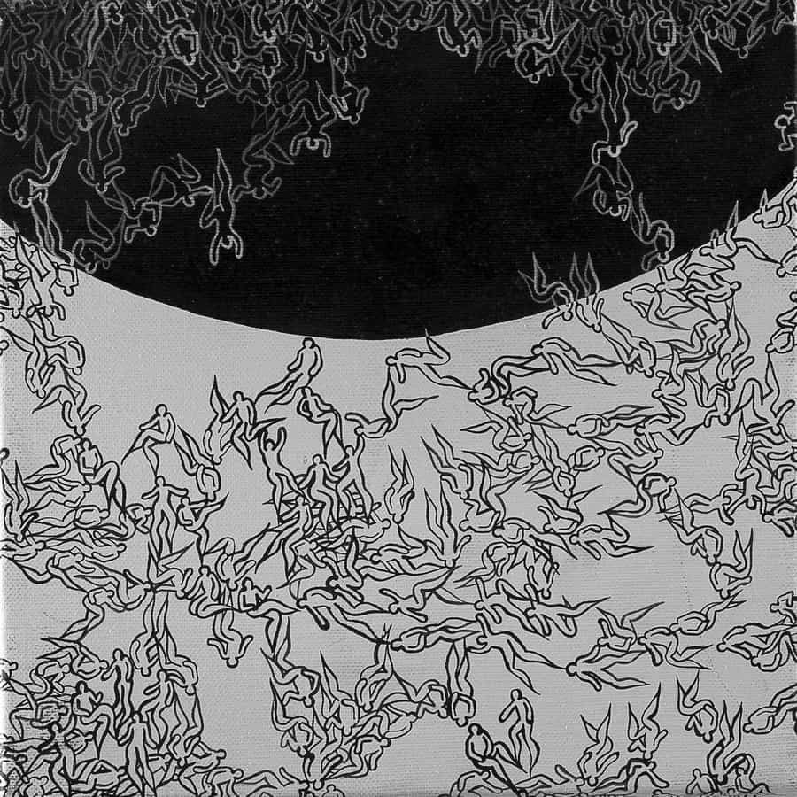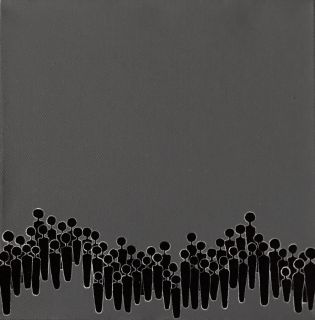 Sulla superficie bianca, matasse di nere silouettes, si aggrovigliano e dipanano creando un movimento concitato, parossistico; incontro e scontro di omini urlanti che sembrano uscire impazziti da un formicaio distrutto dal piede di un bambino dispettoso che ne ha sconvolto l’ordine.
